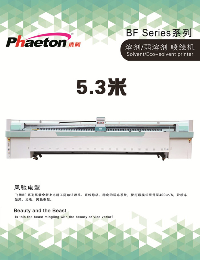 飛騰BF系列搭載全新上市精工阿爾法噴頭、直線導軌,穩(wěn)定的送布系統,使打印模式提升至400㎡/h,讓噴車如風、如電,風馳電掣。