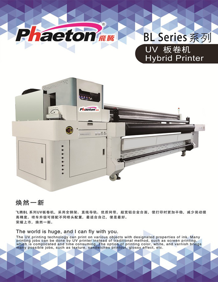 飛騰BL系列UV板卷機,采用全鋼架、直線導軌、優(yōu)質網帶,超寬鋁合金臺面,使打印時更加平穩(wěn),減少晃動提 高精度。噴車升級可搭配不同噴頭配置,最適合自己,便是最好。 榮耀上市,煥然一新。