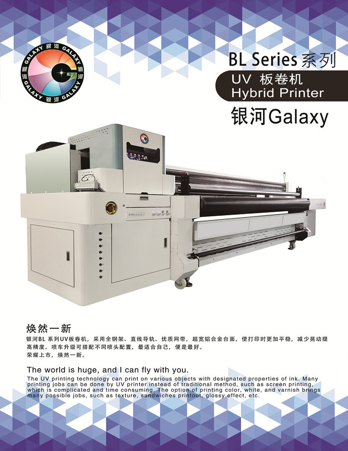 銀河BL系列UV板卷機,采用全鋼架、直線導軌、優(yōu)質網帶,超寬鋁合金臺面,使打印時更加平穩(wěn),減少晃動提 高精度。噴車升級可搭配不同噴頭配置,最適合自己,便是最好。 榮耀上市,煥然一新。